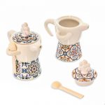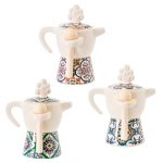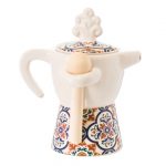 Bomboniera zuccheriera o portaspezie in porcellana a forma di moka/caffettiera con cucchiaino in legno, decorata con maioliche, arrivano miste in 3 modelli, misura h 12 cm.